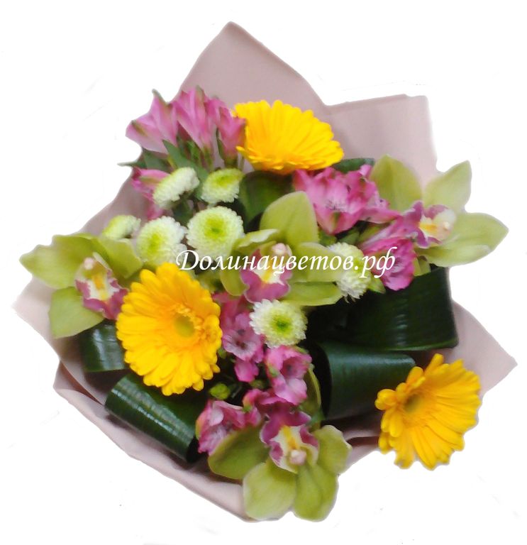 Брызги шампанского 2860 руб. В корзину Состав: гербера,альстромерия, орхидея цимбидиум, хризантема кустовая, зелень.Упаковка: крафт-бумага. Состав: гербера,альстромерия, орхидея цимбидиум, хризантема кустовая, зелень.Упаковка: крафт-бумага.