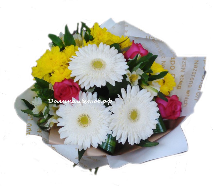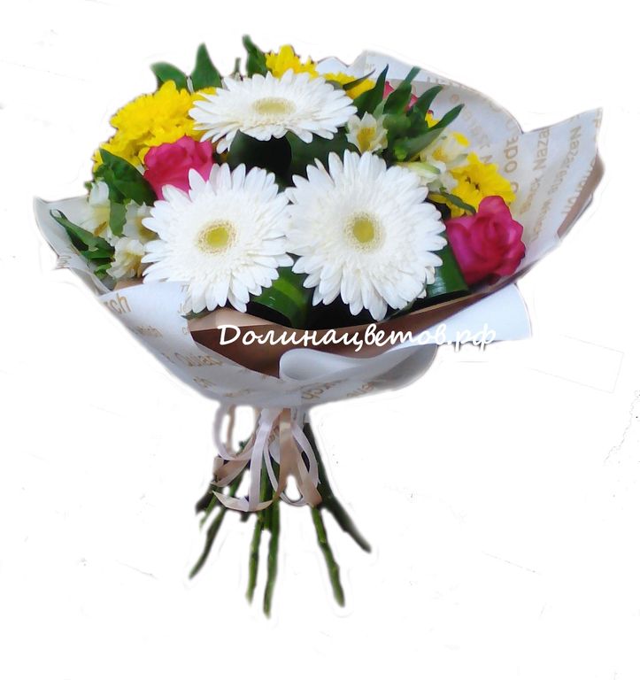 Элеганс 2590 руб. В корзину Состав: гербера, роза, альстромерия, хризантема кустовая, зелень.Упаковка: крафт-бумага. Состав: гербера, роза, альстромерия, хризантема кустовая, зелень.Упаковка: крафт-бумага.