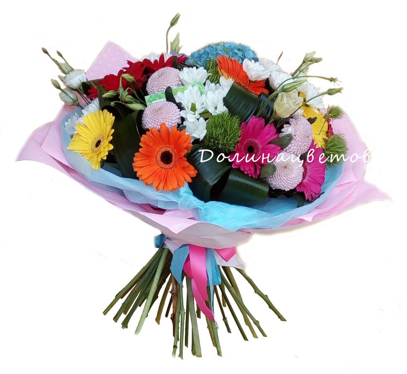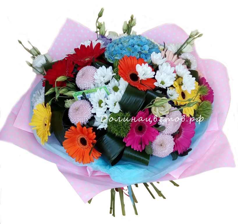 Клумба 7530 руб. В корзину Состав: гербера, хризантема, гидрангея, лизиантус, зелень.Упаковка: крафт-бумага. Состав: гербера, хризантема, гидрангея, лизиантус, зелень.Упаковка: крафт-бумага.