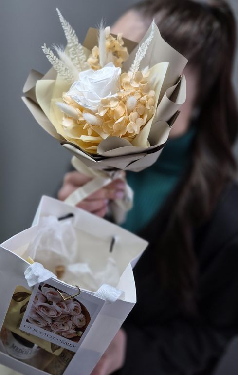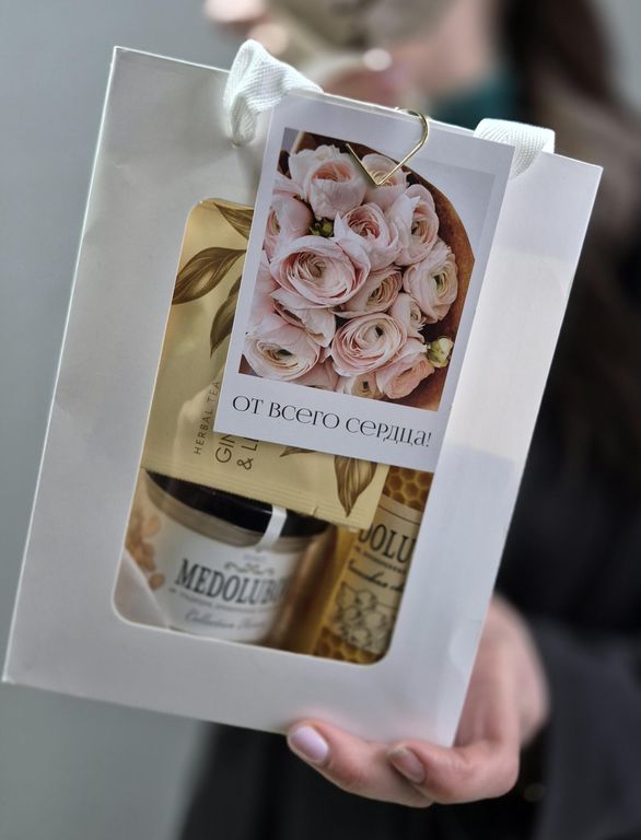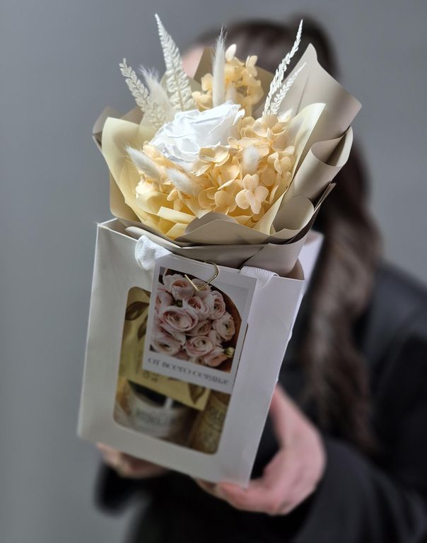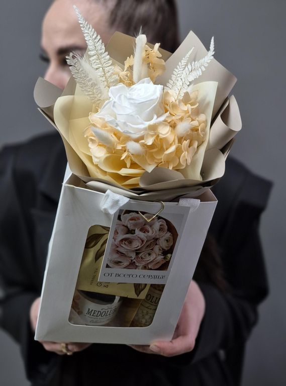 Состав: роза стабилизированная, лагурус, папоротник стабилизированный, гортензия стабилизированная, свеча медолюбов ручной работы, колба со спичками, мёд медолюбов с кедровыми орехами, чай с имбирём и лимоном, открытка, упаковка.