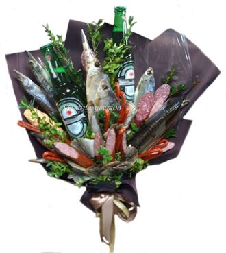 Состав букета: сыр, колбаса, рыба вяленая, рыба копчёная, зелень.