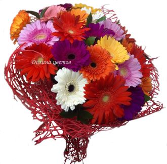 Радуга 3500 руб. В корзину 21 гербера микс. 21 гербера микс. Описание Описание Арт. Б-0045Состав букета: гербера, зелень.Оформление: сезаль.